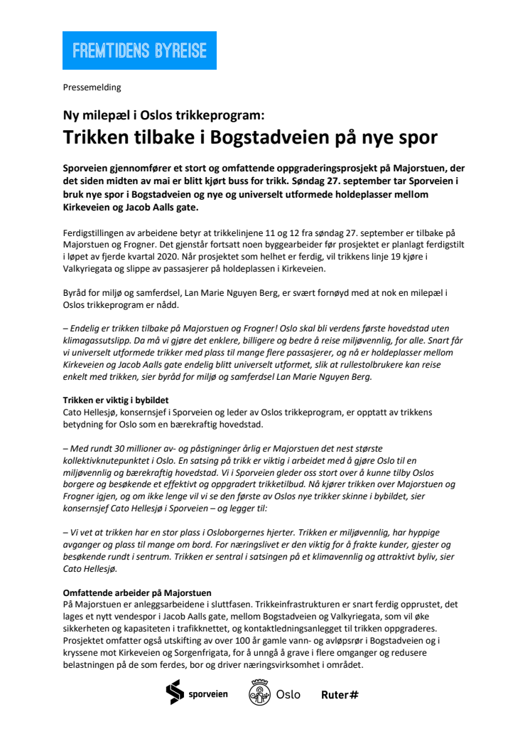 Sporveien gjennomfører et stort og omfattende oppgraderingsprosjekt på Majorstuen, der det siden midten av mai er blitt kjørt buss for trikk. Søndag 27. september er trikkens linje 11 og 12 tilbake i Bogstadveien og over Frogner.