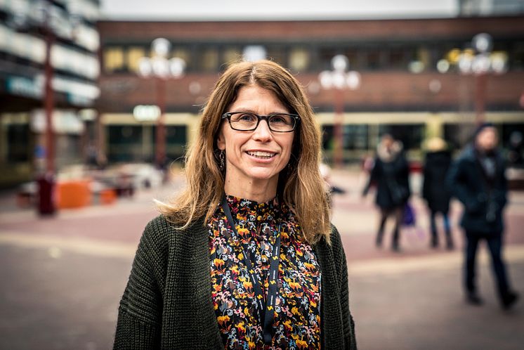 Kvinne med langt hår og svarte briller. Hun har blomstrete bluse og en grønn strikket jakke over. Hun har Sporveiens nøkkelkort rundt halsen.