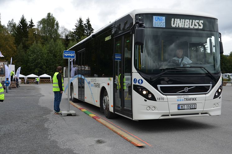 En av øvelsene var å stoppe på holdeplass, så nærme kanten som mulig og med bakdøren midt på holdeplassen.