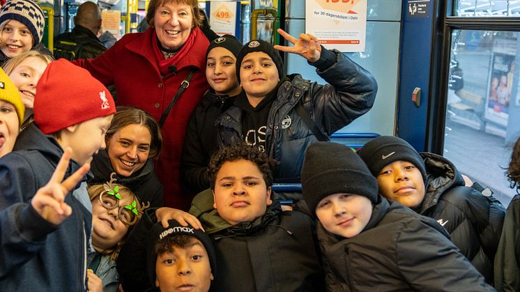 Starten for årets julefeiring i Sporveien gikk klokka 1230 i dag, fredag på Stortorget. Da tente ordfører Marianne Borgen lysene på årets Lystrikk – godt sekundert av femteklassinger fra Grünerløkka skole – for ikke å glemme nissemor.