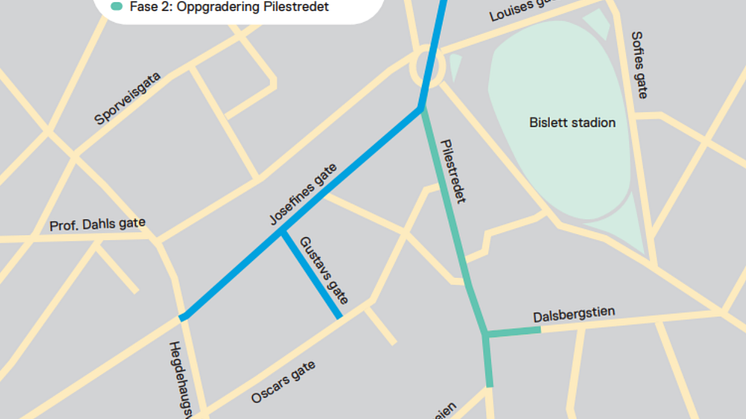 - Fase 2 starter med oppgradering av trikkeinfrastrukturen i Pilestredet, fra Parkveien til Sporveisgata. Dette skjer etter planen når Ring 1 gjenåpner for trafikk i 2027. På samme strekning skal nærmere 150 år gamle vann- og avløpsrør byttes ut.